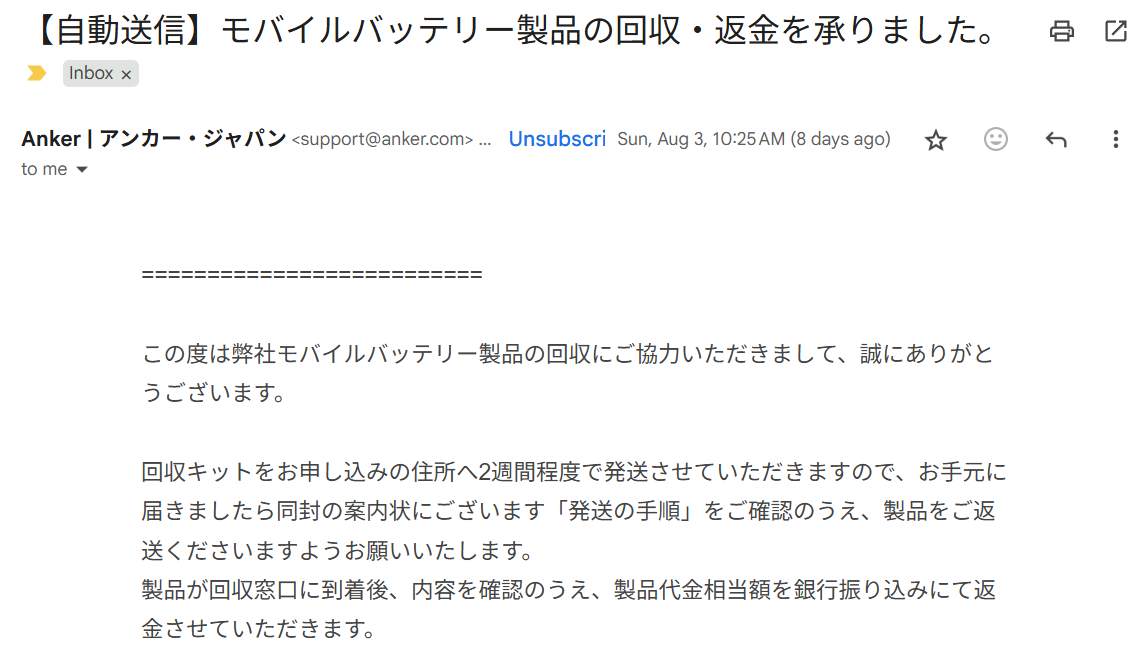 しかし、なにか具体的な事故があった、という訳ではなく、Anker社の内部基準に満たさない部品がAnker社には内緒で(大問題だと思いますが)、製造依頼会社によって使用されていたことが発覚したため自主回収をする、とのことでありました。