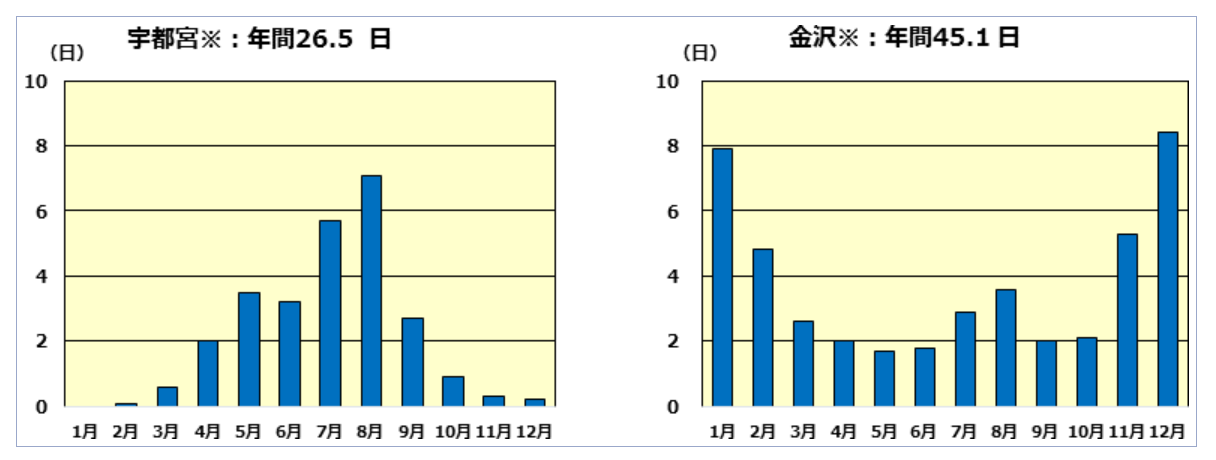 (実は私の住んでおります日光の方が、宇都宮よりもさらに雷が多いように思われますが、気象庁の観測データが無いため、宇都宮市を代表と致します。)