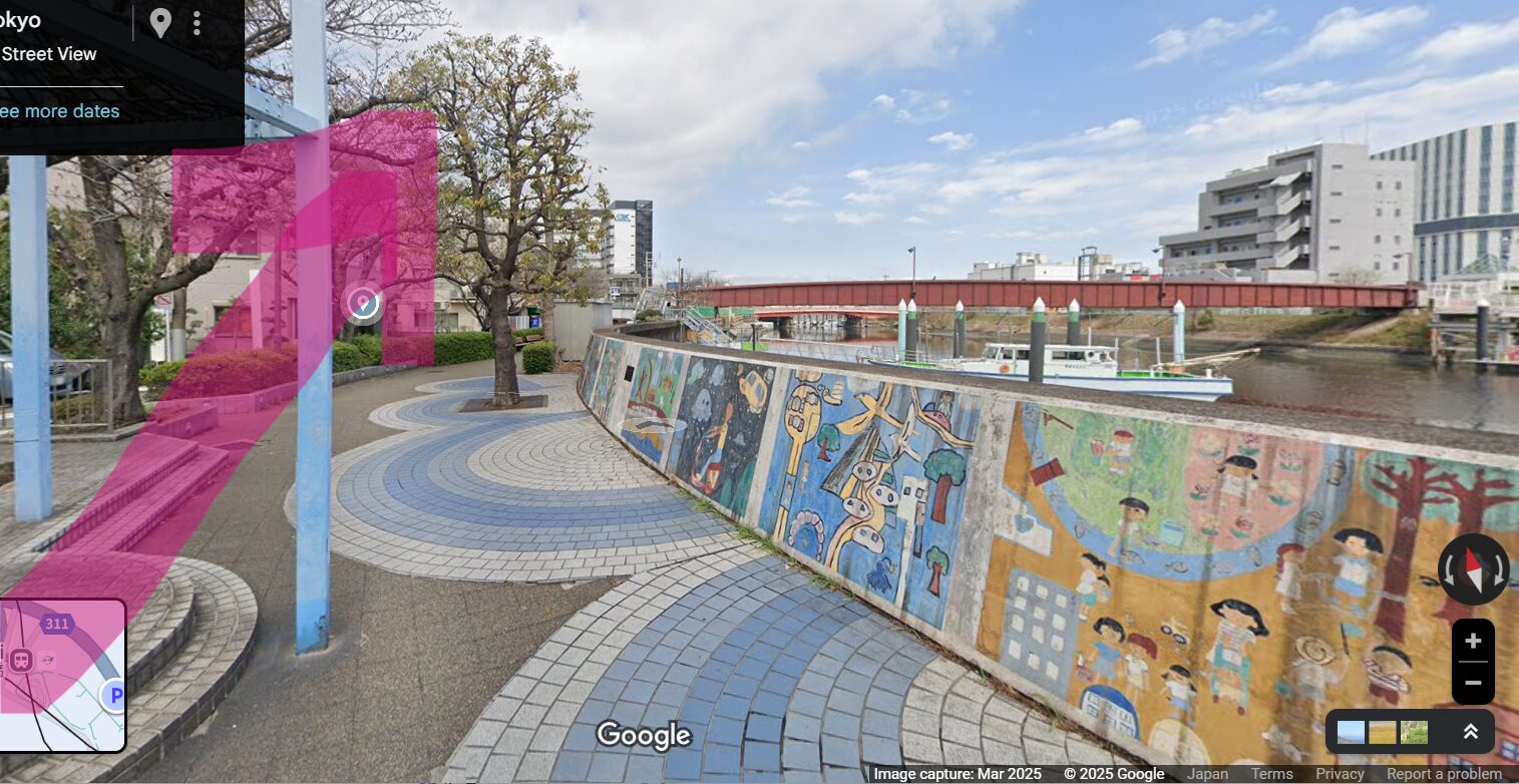 この時、先に穴堀橋交差点を北に渡り、都道311号線の北側を走るのが良いでしょう。