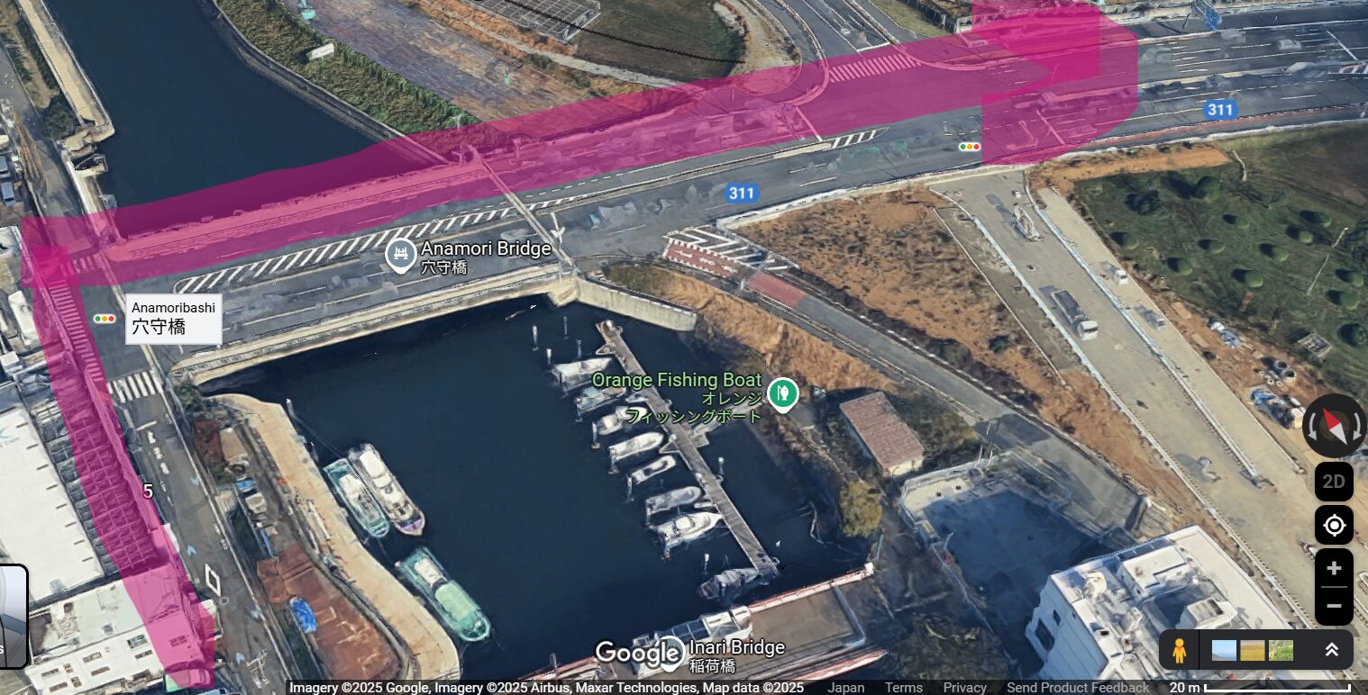 もっとも重要なのは、天空橋(画像中央右にある赤い橋)に近づいてから、どのように走るか、です。
