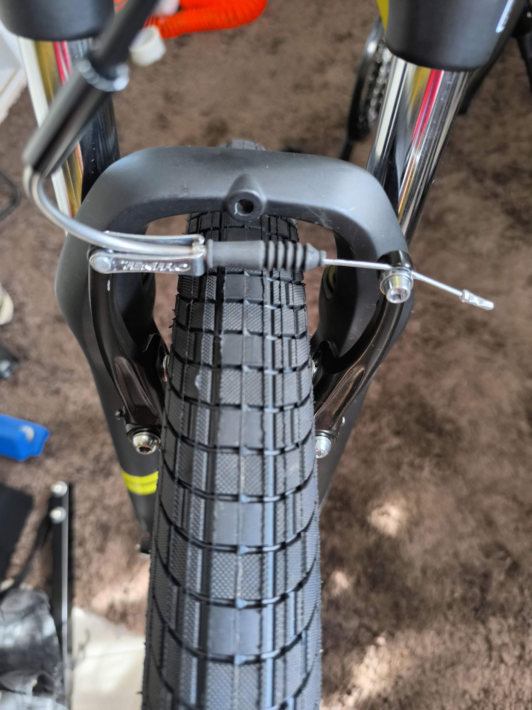安価な車体で、レバーもブレーキも剛性が低く、強くレバーを引くとハンドルバーに当たりそうになります。