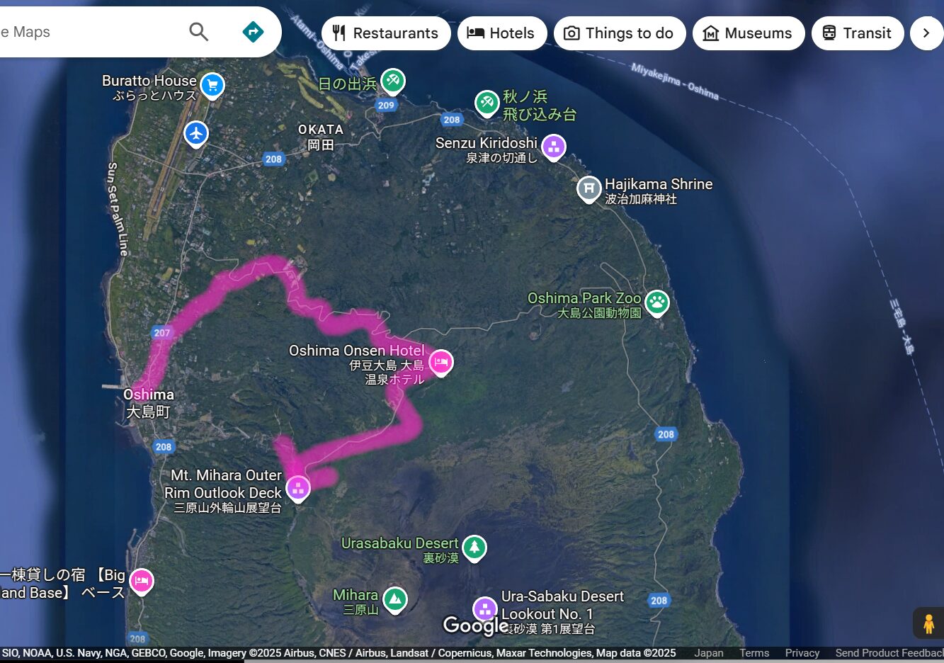 元町港からスタートして、都道207号線の東側道を北東に進み、都道207号線に合流した後は、道沿いに登って三原山の頂上を目指します。