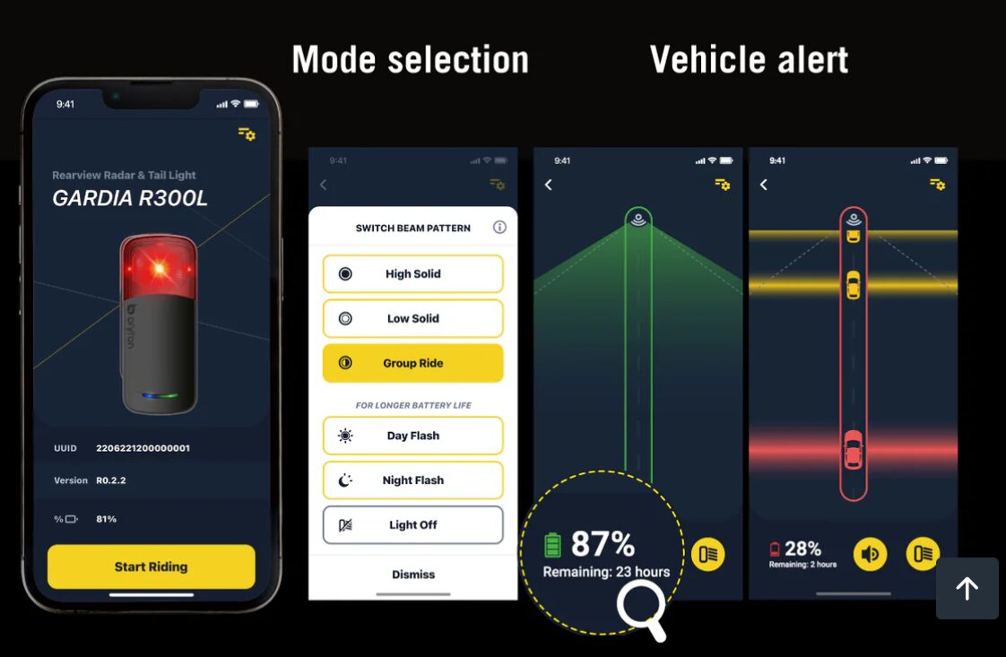 サイクルコンピューターからリアライトのオンオフができるのはもちろん、後方から接近してくる物体を検知して、警告を出してくれます。