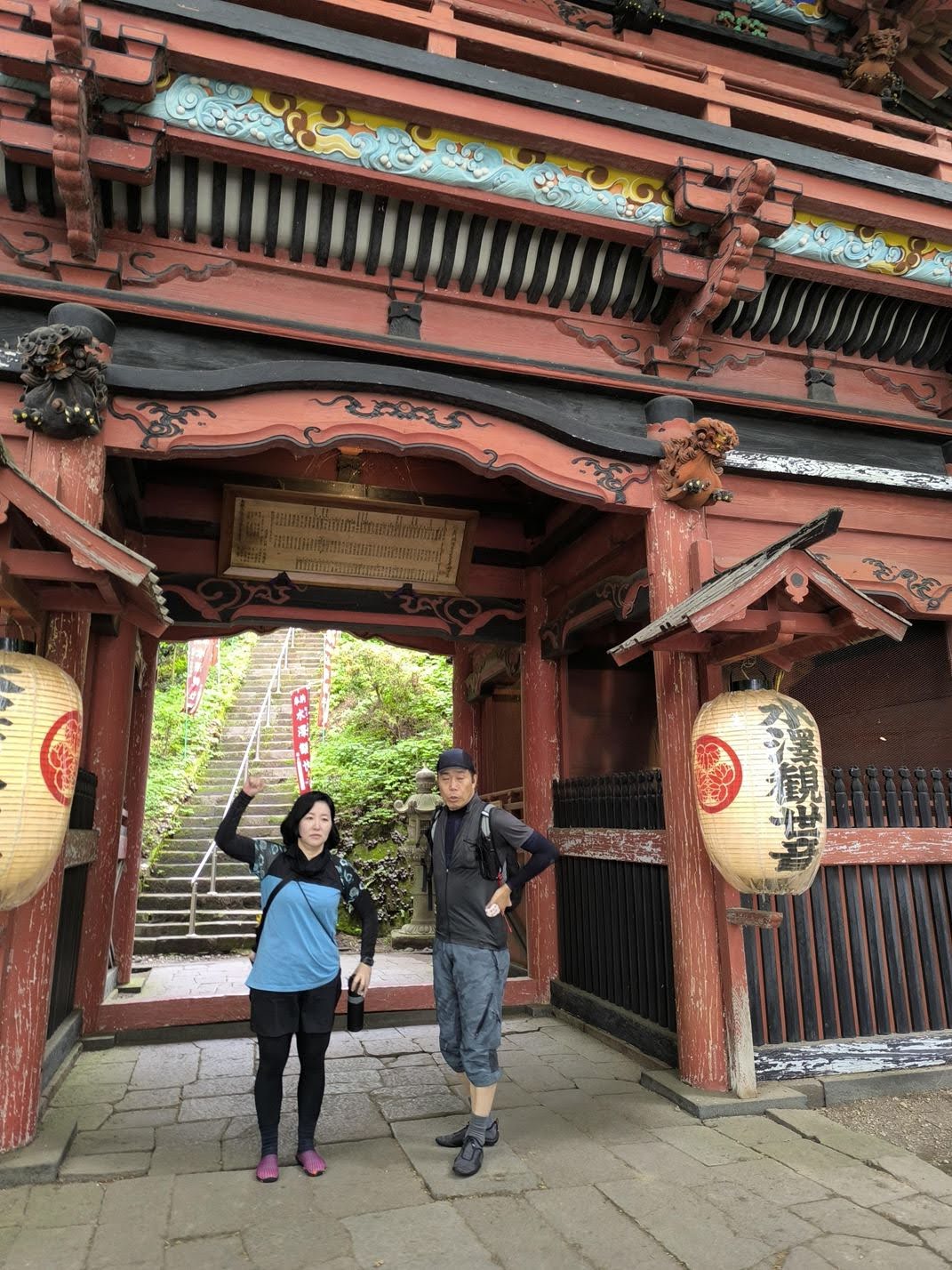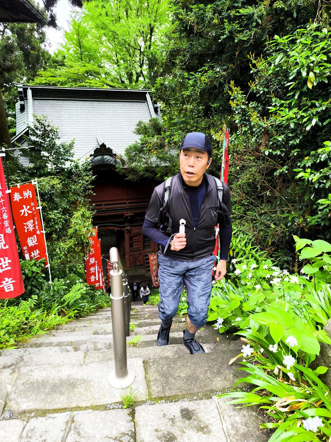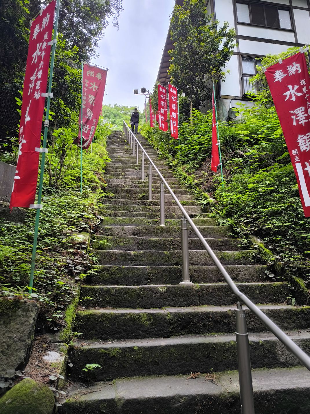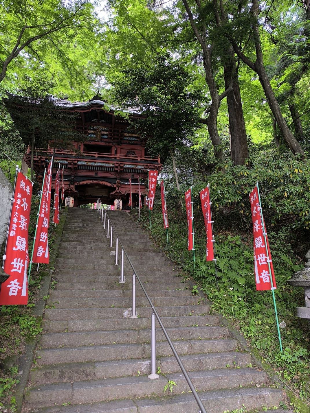 水澤寺は急斜面に作られたお寺で、いきなり凄まじい角度、数の階段が出迎えてくれます。