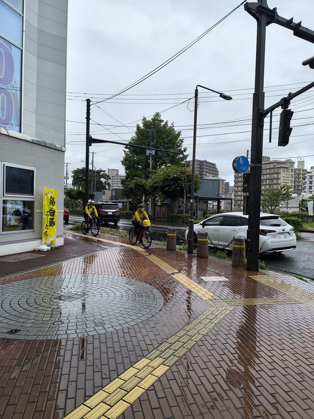 雨の都市部を走るときは、道路の点字ブロックや側溝の金属部分が滑りやすくなるため、特に注意が必要です。