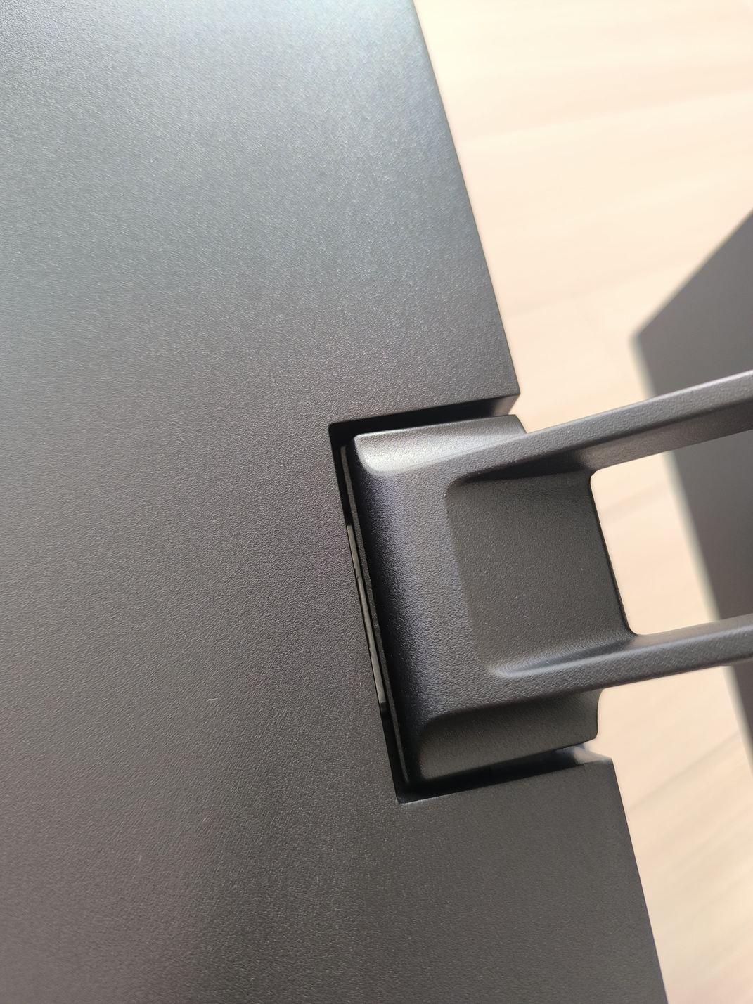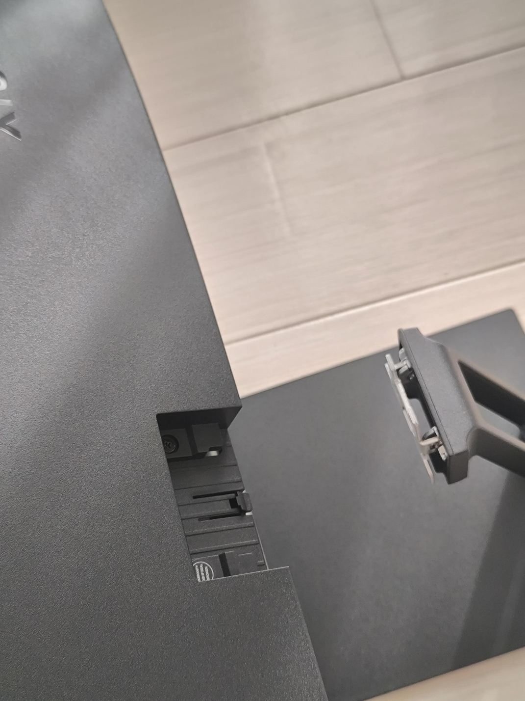 固定したモニタ台座を、モニタ本体に取り付けます。
