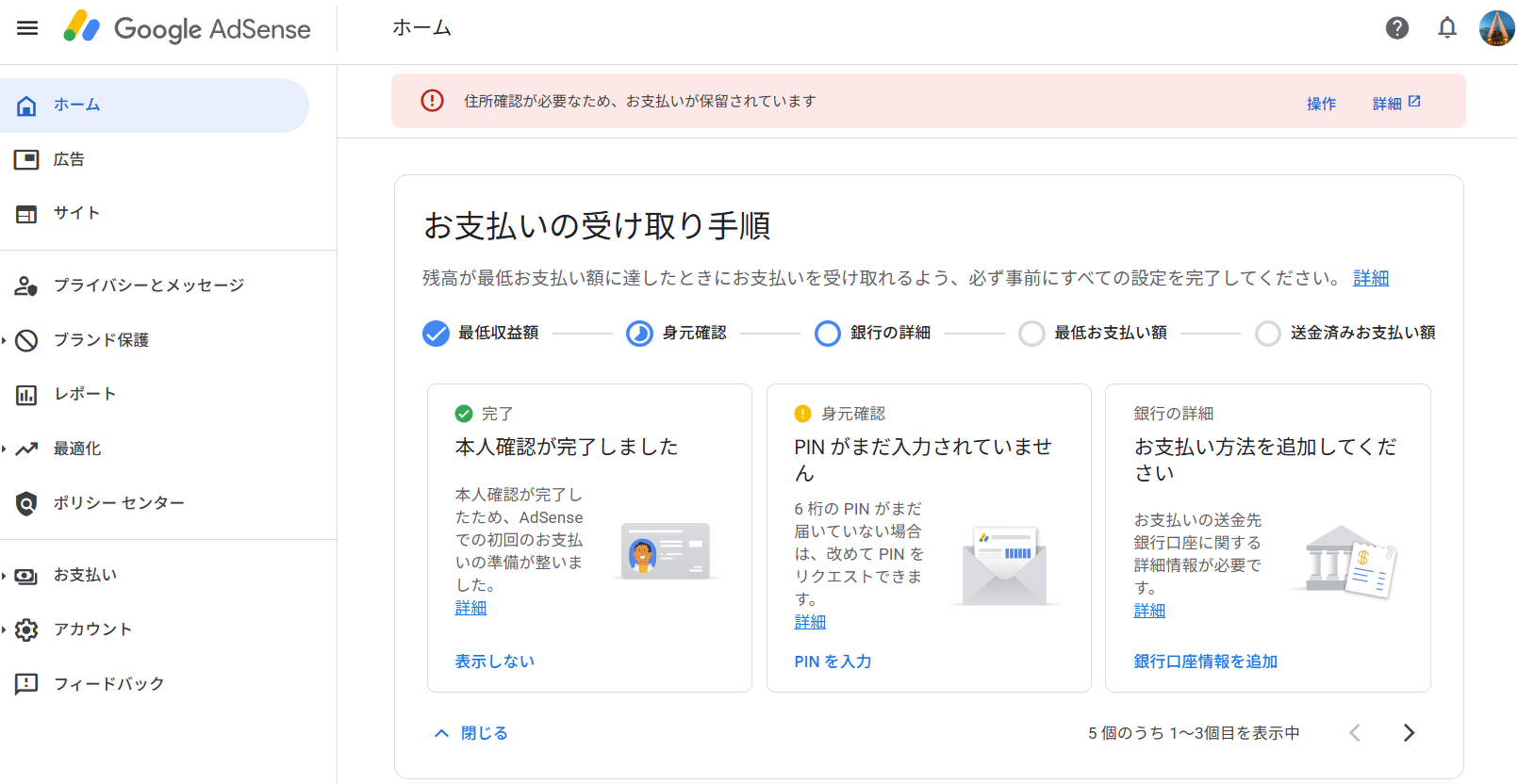 大歓喜!! / Google AdSense 住所確認が必要なため、お支払いが保留されています PINコード入力 天下への道
