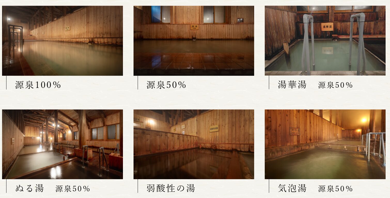 お風呂は源泉100%のもの、50%のもの、さらに濃度の低いもの、など複数種類があります。