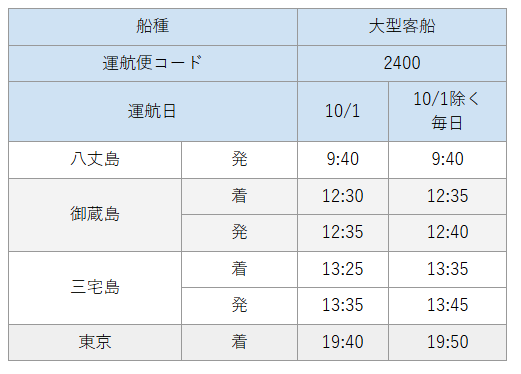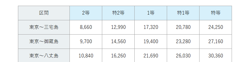 季節により運賃に変動がありますが、東京(竹芝埠頭)から八丈島まで、¥10,840-¥30,360ほどです。
