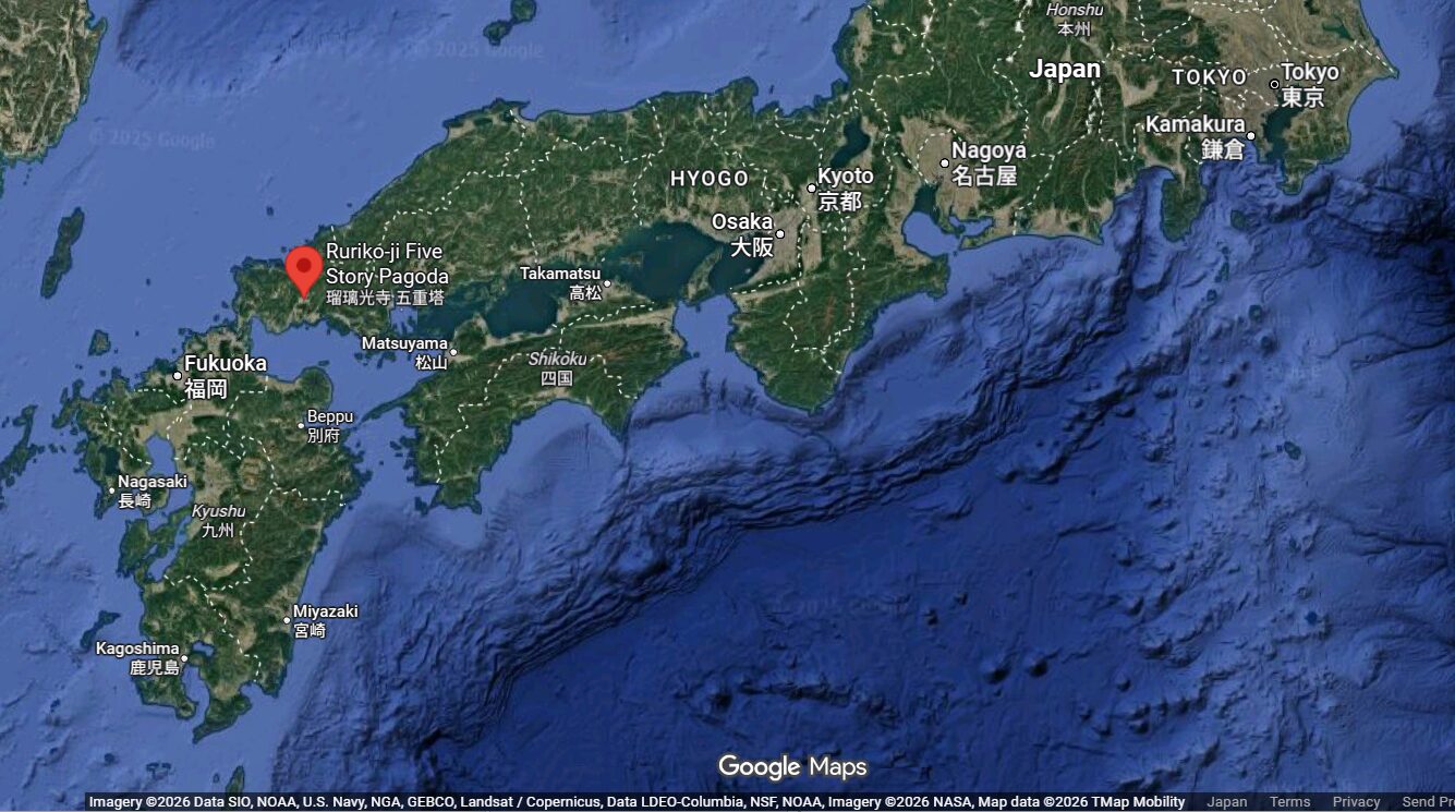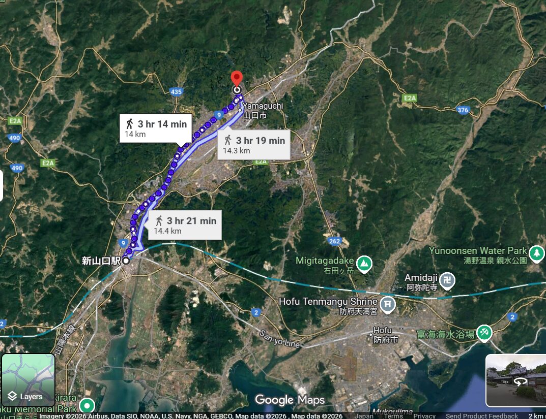 新幹線の止まる、新山口駅から瑠璃光寺 五重塔まで14kmほどです。
