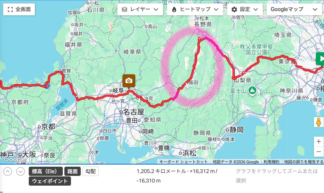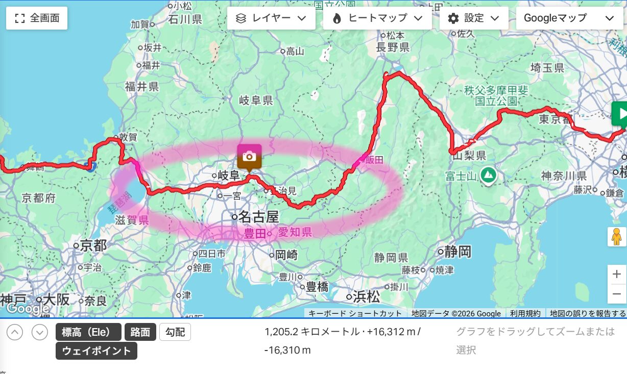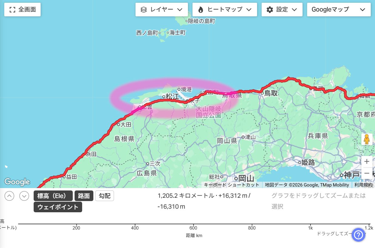 走行距離 1,205.2km 獲得標高の目安 16,312mです。