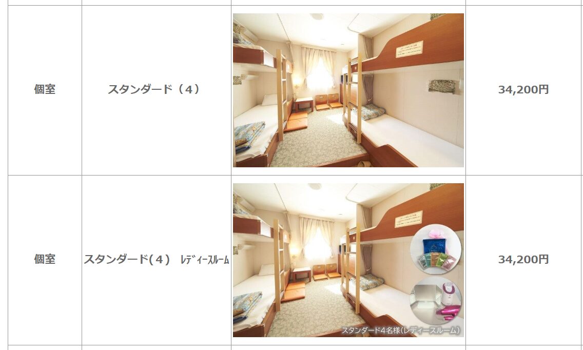 追加料金なしで、各種の女性専用船室を予約、利用可能です。