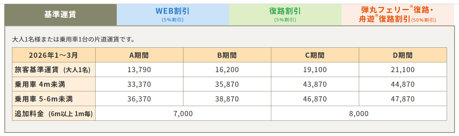 さんふらわあ号の場合、時期、お部屋によって運賃は異なりますが、年末年始、いわゆるゴールデンウィークなどの特殊な日をのぞけば、概ね¥15,000-¥20,000くらいに収まるように設定されています。