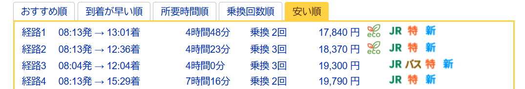 途中まで新幹線を使っているから、速そうに思えても、実際は5時間-7時間かかります。