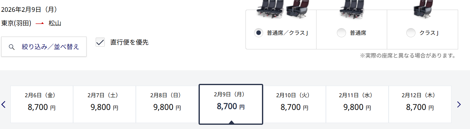 続いて、松山空港も同様に¥8,700から。