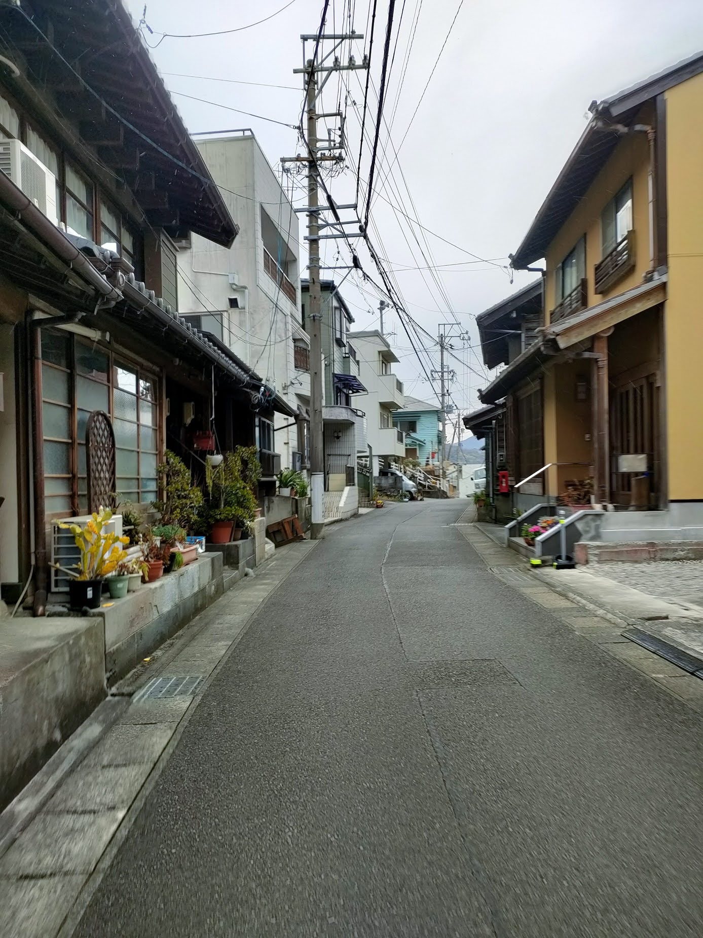 宿場町によくある地形で、商店、お宿などが、人が往来するだけの幅、つまり現代のクルマ中心社会では狭い道幅で、ずううううっと続いていきます。