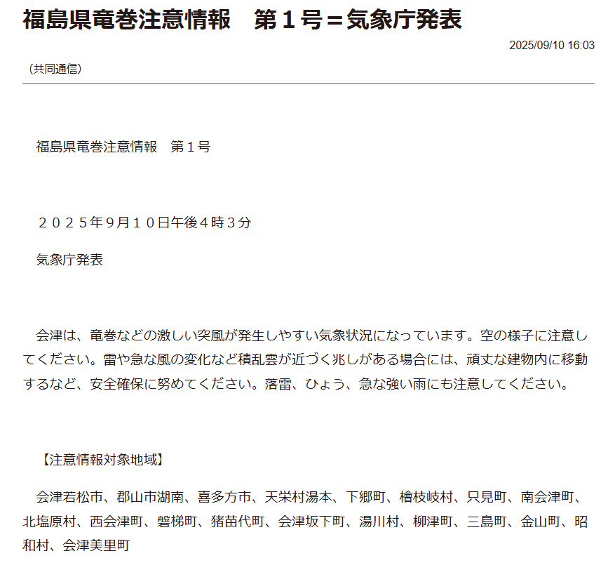 そういうこと、あるの!?と思いましたが、調べてみると、会津地方には竜巻警報というものがしばしば発令されているようです。
