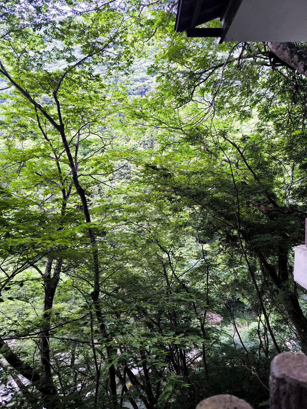 木々が生い茂って、まったく周囲の視線は気になりませんし、目の前には雄大な渓谷が広がっています。