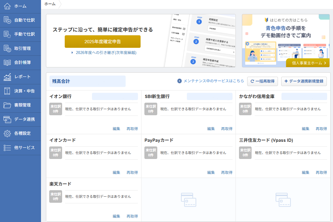 まず、データ連携というところから、お使いの銀行口座、クレジットカードアカウントと連携すると合理的です。