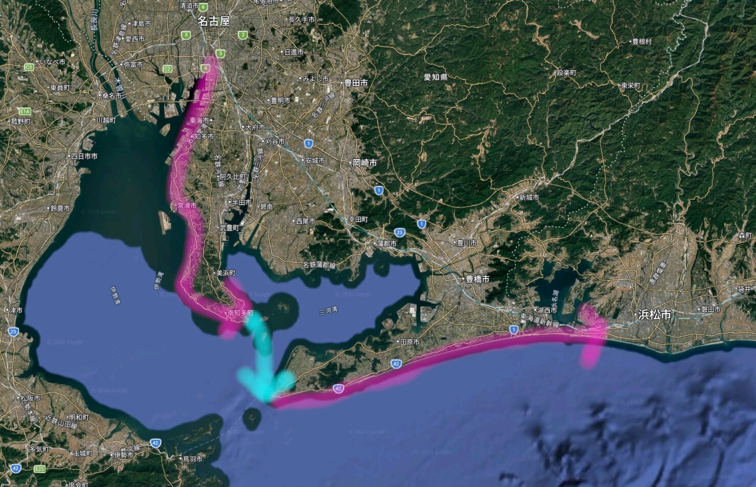 つまり、知多半島と渥美半島を反時計回りに進むことで、北風、西風の両方ともを使うことができます。