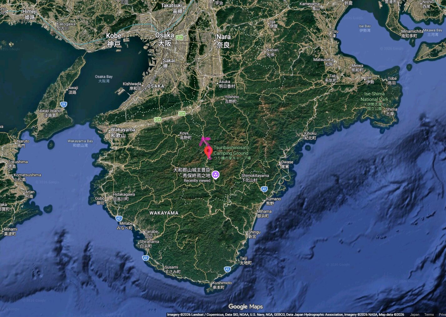現在、つり橋の里キャンプ場というところにおりまして、ちょうど紀伊半島の真ん中に位置しているのが分かります。